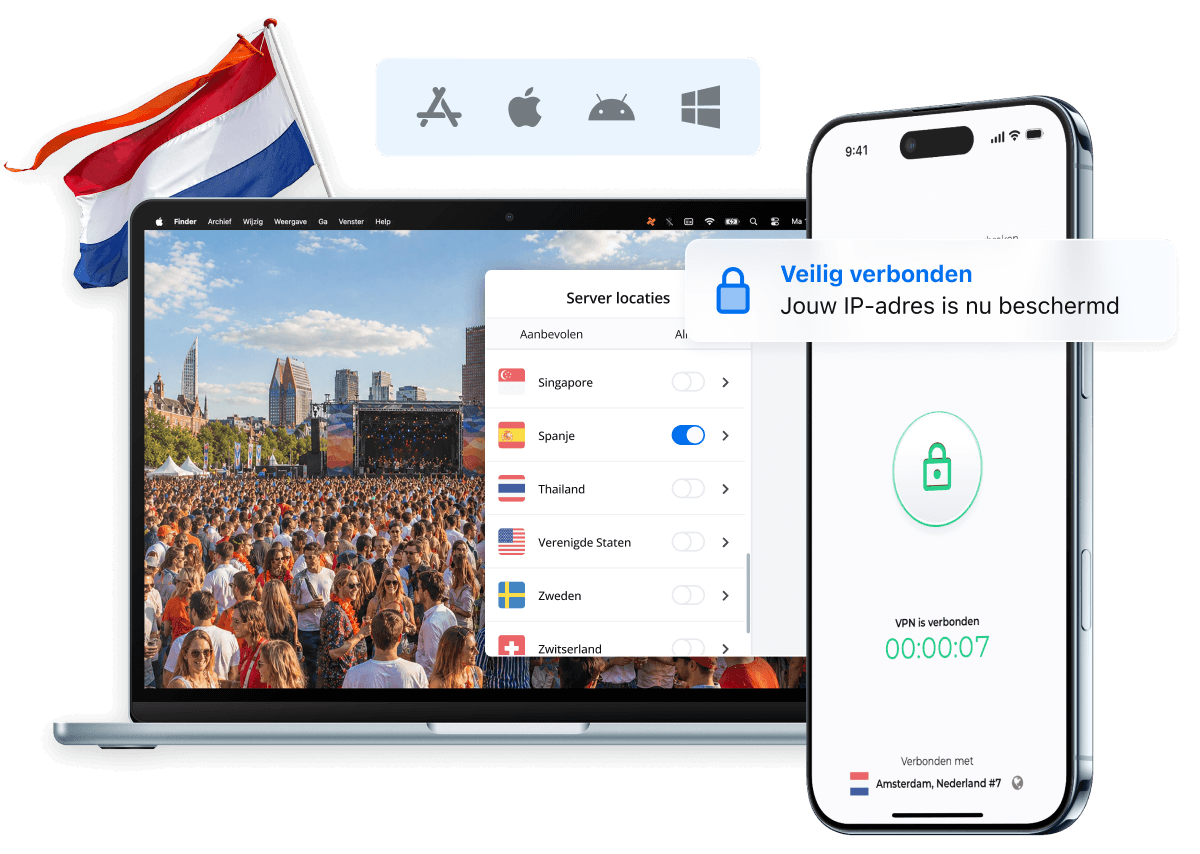 VPN Nederland zet jou op de eerste plaats. Als de officiële VPN van Nederland weten we precies wat je zoekt. Onze VPN geeft je toegang tot het grootste Nederlandse VPN-serverpark ter wereld zodat je altijd een vlekkeloze verbinding krijgt, of je nu thuis of vanuit het buitenland surft. VPN Nederland is volledig compatibel met alle Nederlandse diensten en platforms, waardoor je veilig en overal van je entertainment kunt genieten. Het wordt geleverd met een Nederlandse app en een 24/7 Nederlandse klantenservice die altijd voor je klaar staat.